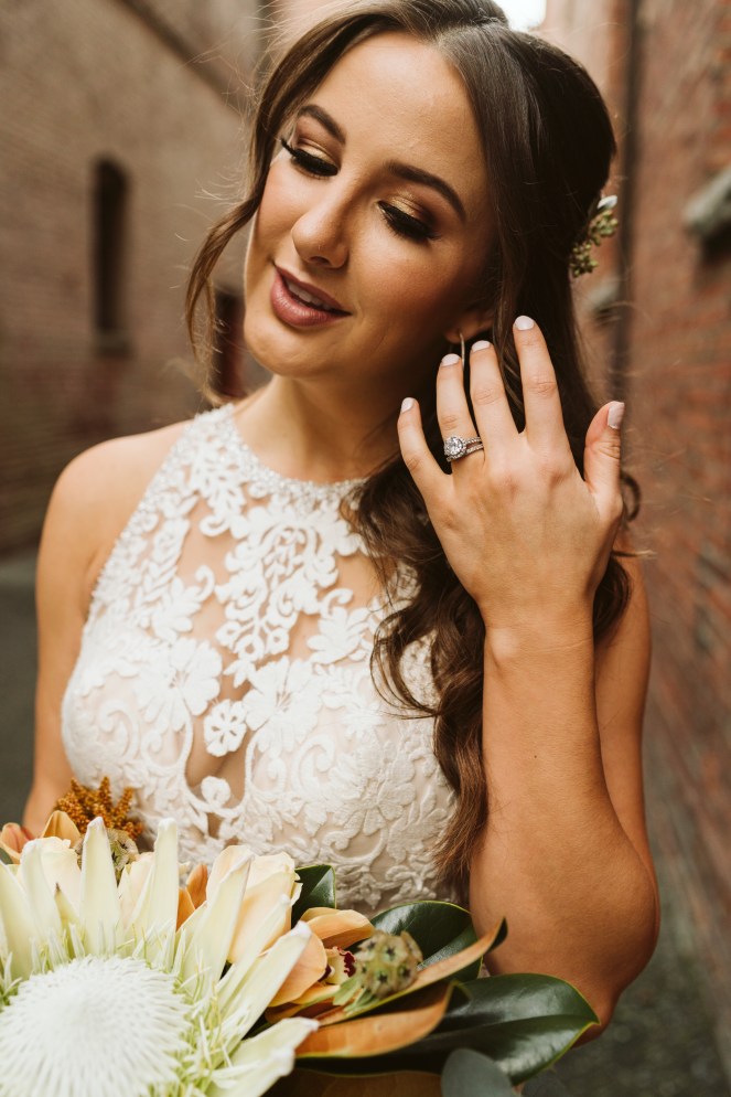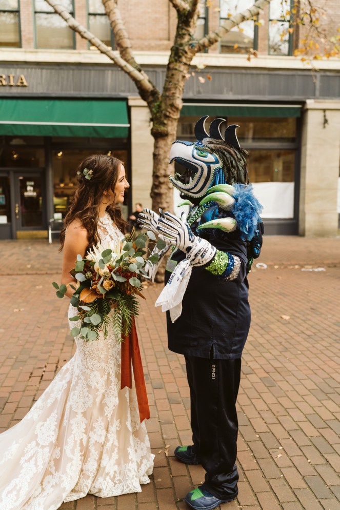 So how does this all work? Our friend from Biola, Ashley Mae, works for the company and reached out to us once we moved to Seattle this year to see if we would want to be the happy couple and obviously, we said yes, I mean, I do. I mean, we will. And that was about it until the week of the event. I went and did a dress fitting to pick out the dress they wanted me to wear for the event (and we ended up choosing four lol) and this time around, they didn’t have a men’s wardrobe designer so Alec picked from his own closet. All we had to do was bring our bridesmaid, groomsman, and “officiant” (hi mom) and show up on event day! Once we got there, the girls got their hair and makeup done for awhile and then we did 3 rounds of photoshoots out in the brisk Seattle streets (on the same day/ same time as a Seahawks game that was about one block down from us). Alec was such a trooper because I smiled for a living for 5 years and if my face was dead after 3 hours of photo taking, his was double-dead.