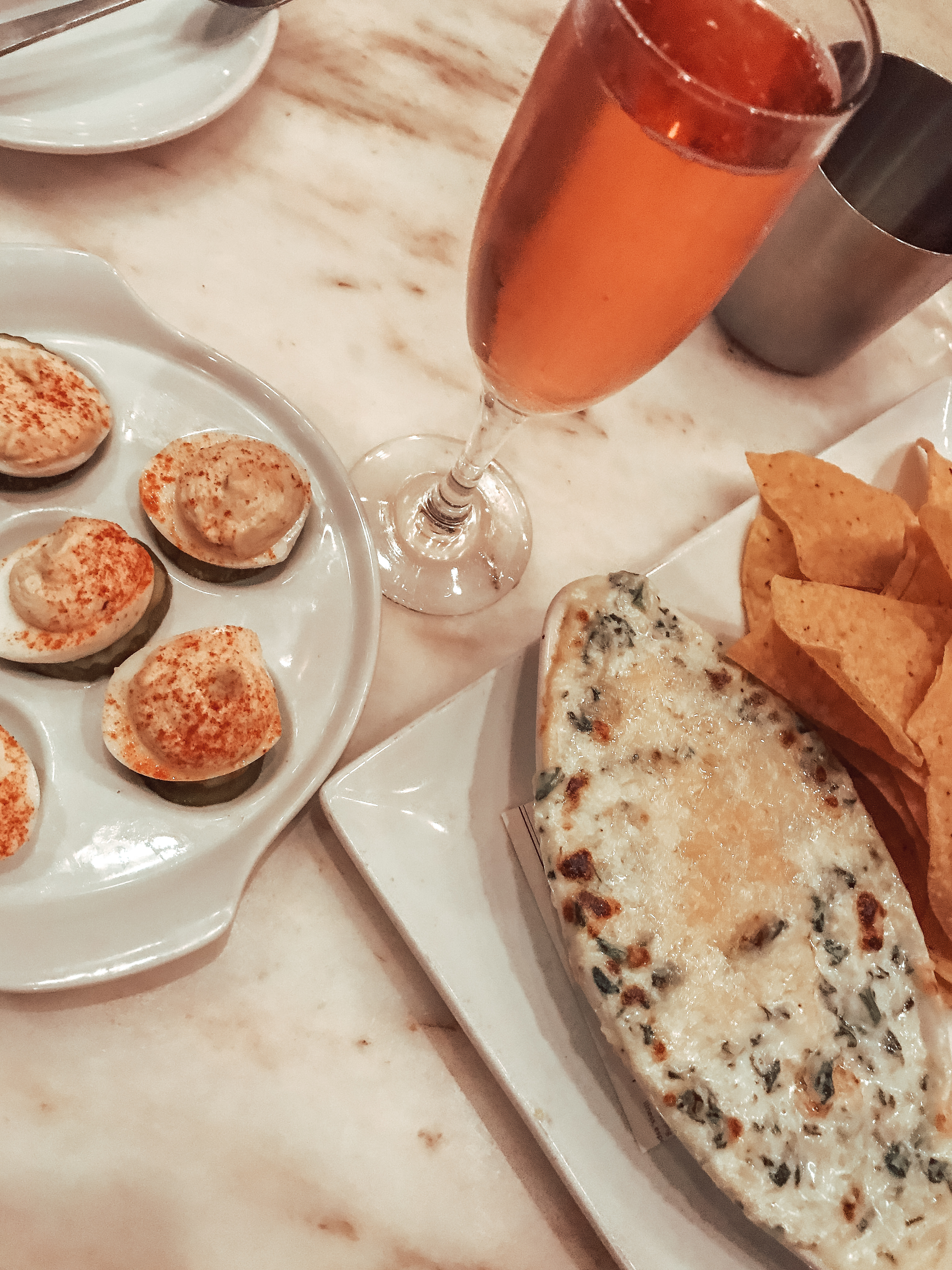 - Merchants. We popped in to this cute little marble decorated place before the hockey game and thankfully found a place at the bar since it was a 3 hour wait for the main restaurant 🙃 We each got a drink and shared some spinach artichoke dip and deviled eggs (ok, those were just for me. Alec wouldn’t dare touch them) AND they bring you seasoned popcorn instead of bread so that’s cool.