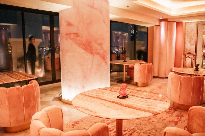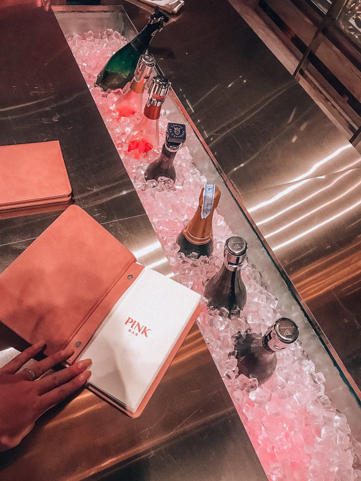 Lebua State Tower: Okay so continuing on from what I said before– the food and drinks at Lebua were outrageous. So much so that the only place we ate there was Cafe Mozu for our complimentary breakfast buffet (nutella crepes every morning hellooooo). It was honestly a bummer. So for example: we wanted to get a drink at the iconic and most famous bar in Bangkok, the rooftop Sky Bar. The verrrrry cheapest glass of wine was $35 USD and most drinks were around $40-$50. So we were like ummm no hard pass. Then we were thinking we would get dinner at one of the FIVE resturants up there. The very cheapest option was a tasting menu for $200 USD a person. They were actually all tasting menus except one a la carte but it was very heavy on the seafood which Alec isn’t a huge fan of/ still very expensive. SO THEN we headed down to the brand new Pink Bar (see photos above) which is an all pink, marble, and velvet champagne bar and of course I was in heaven. No. The cheapest cheapest option there was a $70 USD glass. Every other GLASS was over $100. So….yeah. You must have some luxurious clientele, Lebua.