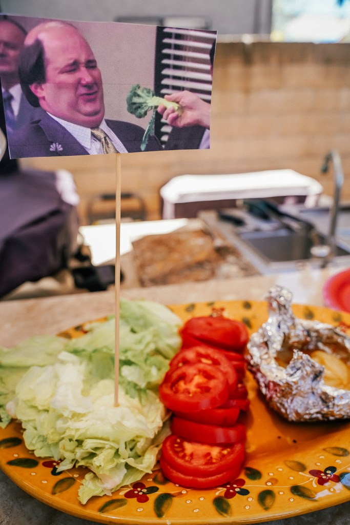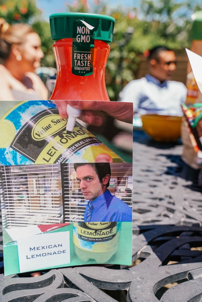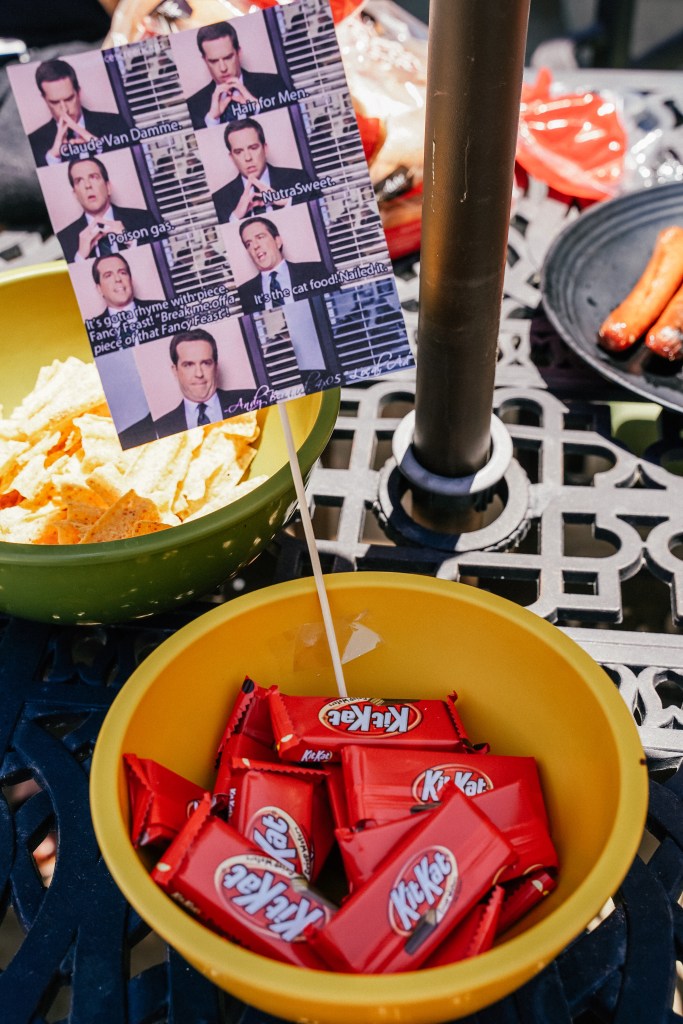 So the next day, I put together a lil get together BBQ at his parent’s house with some of our friends and of course any party I throw has to have some sort of theme (ok maybe not everyyyy party but don’t themes just make it more fun!?). I was going to be gone with wedding festivities and the morning of the party we rented an electric duffy boat to go around Newport Harbor for Alec’s bday so I wasn’t going to have much prep time. So I tried to pick a theme that would require the bare-minimum as far as set up goes and ta-da, The Office themed party was born. I’m serious…all I did was print a bunch of pictures out on cardstock ahead of time along with a birthday sign and tape them to skewers and then buy a handful of specific foods to match said pictures. I wasn’t even organized enough to blow up sad deflated grey and black baloons (if you know, you know). All things considered, I think it turned out pretty darn good for what it was. Good food, good drinks, good weather, good people, and good Office memes are all you need for a solid party…