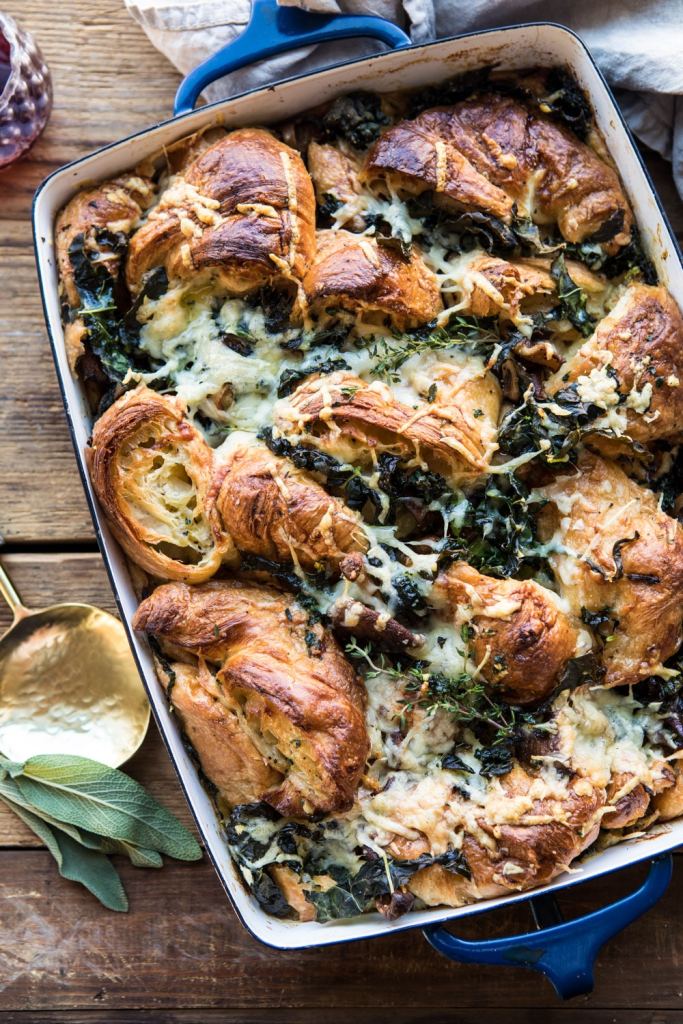 - In a very large mixing bowl, whisk together 2 cups broth and the eggs. Add the toasted croissants and the mushroom/kale mixture + all the butter left in the skillet, gently toss to combine. If the mix seems dry, add addition broth, 1/4 cup at a time until all the bread is moist. Pour the mixture into the casserole dish. Top evenly with cheese.