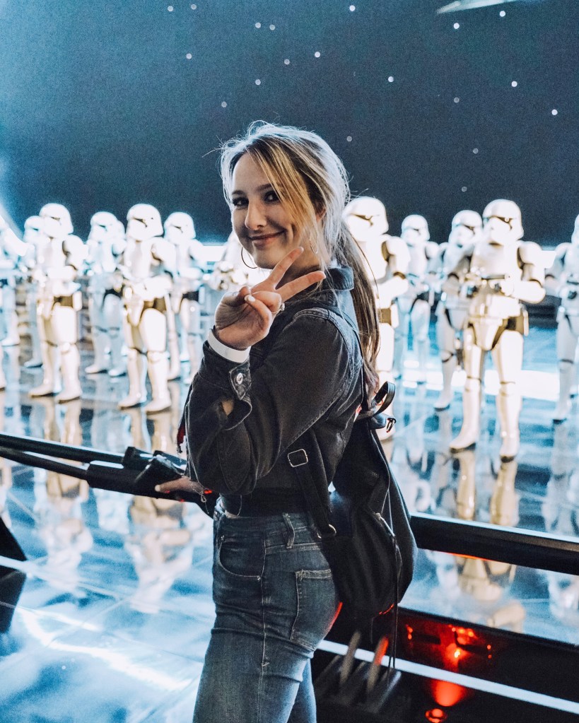 CLEARLY we were done with posing and photos by the fourth day 😂 But that’s ok because it was our quick-paced half-day AND we were up at 5am to get ready, get our bags packed and down to bell check and get ourselves over, through the crazy Star Wars crowds to get in by 7am so we could get a Rise of the Resistance boarding pass. If you are planning a trip and wanting to get on Rise of the Resistance (WHICH YOU SHOULD because it was truly the best Disney ride I have been on and I am a tough critic), please watch my video above to hear my tips and tricks on getting a boarding pass…because it was honestly really stressful lol.