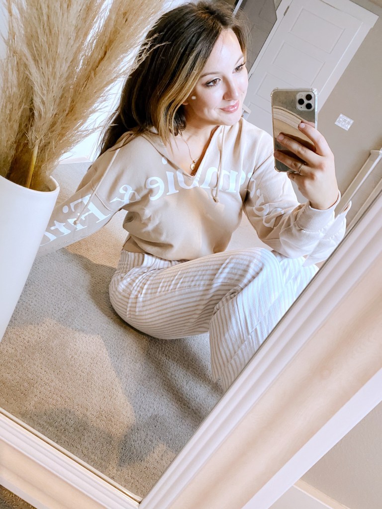 Last but certainly not least, is my new favorite sweatshirt! How cute is this?! I have had so many people on Instagram already ask me about it after a story I posted in it. I literally haven’t taken it off since I got it lol. It is more cropped than I thought but I am a cropped fan, so it’s all good. They also have four different beautiful colors to choose from.