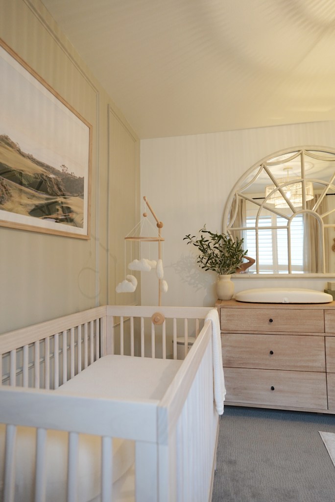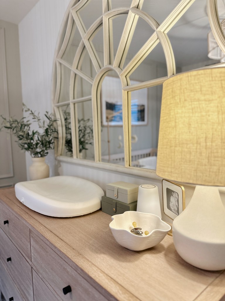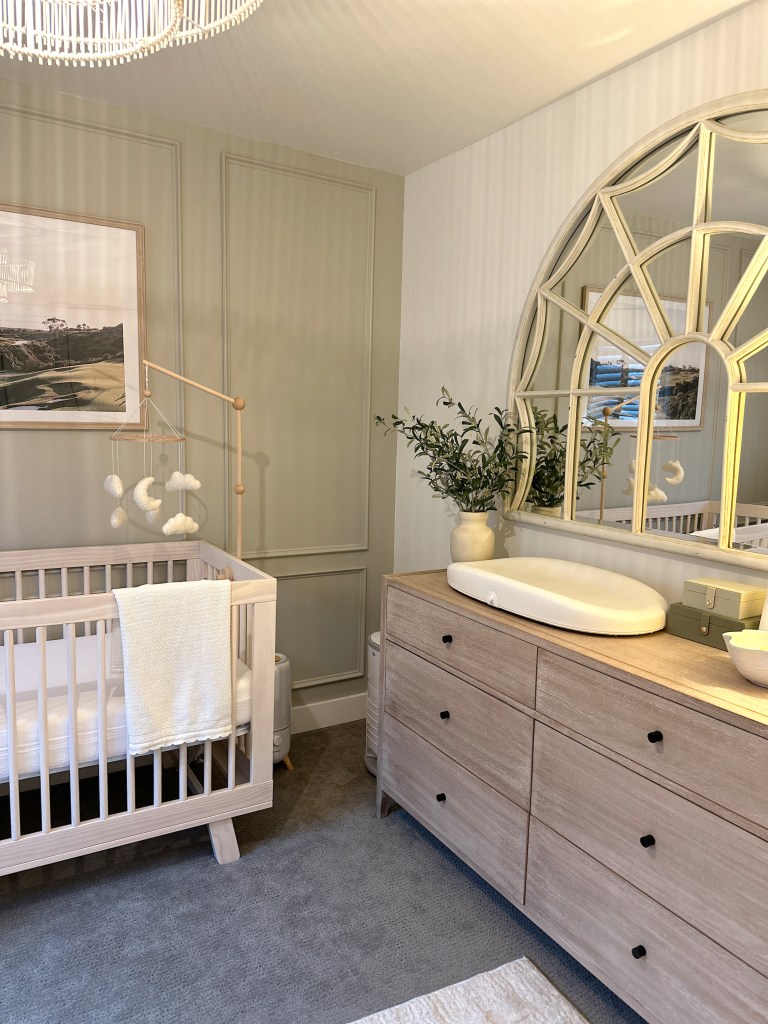 A few notes before links and pictures! The accent wall color is Jogging Path by Sherwin Williams. The mirror is so gorgeous and was passed down to us from my parents when they redecorated so it is unfortunately unlinkable. The photo is actually from our wedding day at Pelican Hill Resort. Our photographers took this one random landscape photo that I never thought I’d use until we decided to go for a very subtle golf theme for the nursery and I remembered this photo!