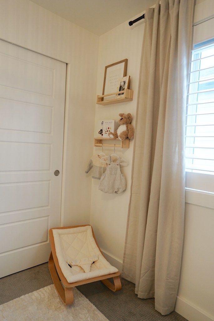 Wooden shelves | Glider | Crib mattress | Crib sheet | Curtains | Curtain rod | Wall frame